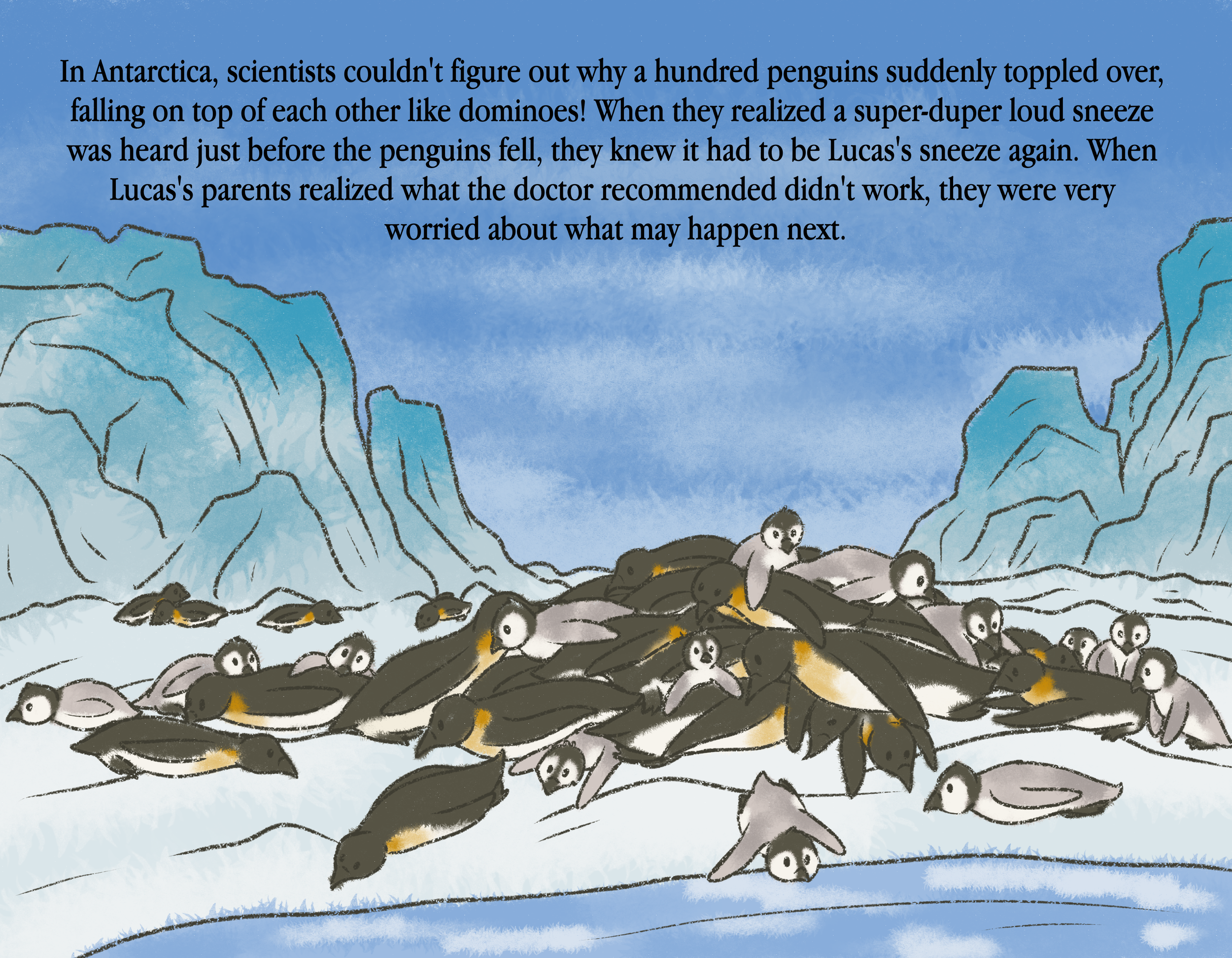 Lucas has a sneeze like no other. What starts as a tiny baby sneeze soon grows into something much bigger- knocking over sandcastles, creating bathtub tidal waves, and even rattling landmarks around the world.